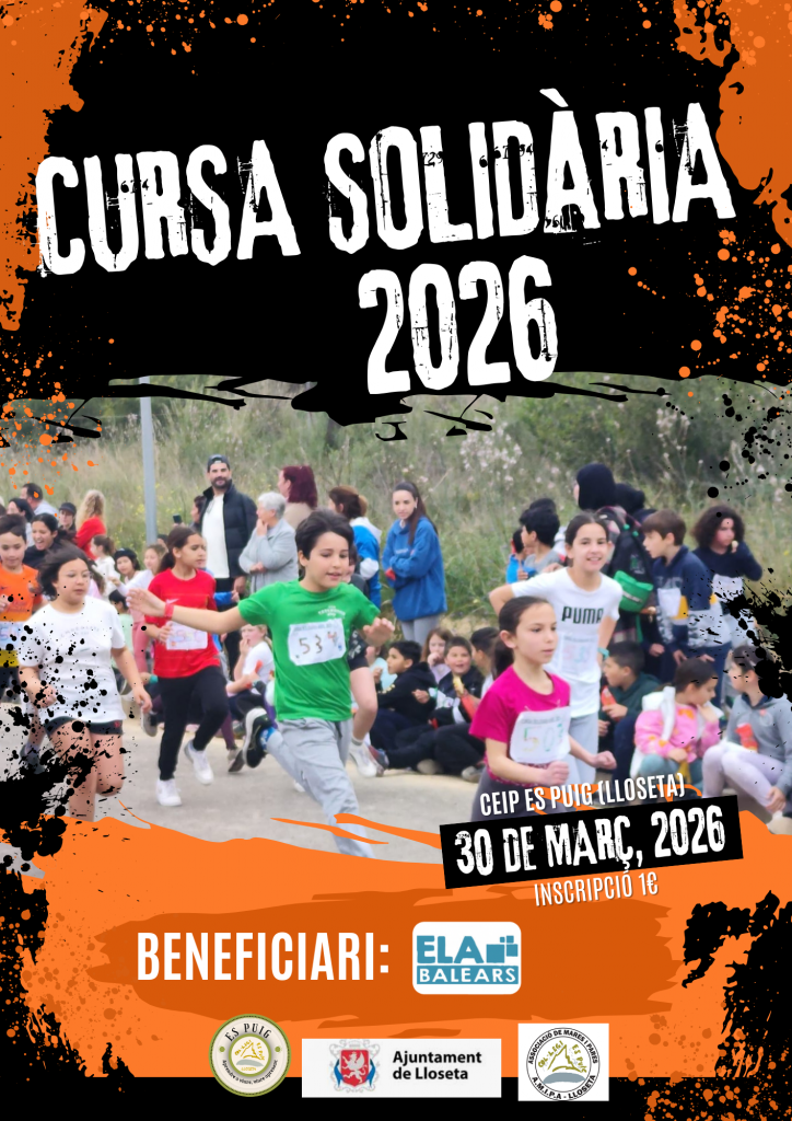 Volem informar-vos que el pròxim 30 de març al CEIP Es Puig es durà a terme la nostra CURSA SOLIDÀRIA a benefici de ELA BALEARS. La cursa es realitzarà al camp de futbol, com a novetat d’enguany. Tota la Comunitat educativa està convidada a participar.