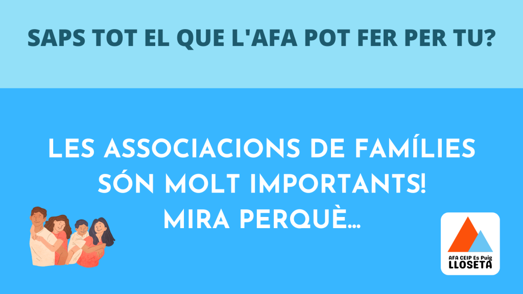 - Perquè organitzem un munt d’activitats lúdiques i pedagògiques per infants i famílies: Jornades de patis, la bicicletada, la campanya de recaptació de fons pel viatge d’estudis de sisè, el projecte Camina la Teva Escola i el projecte Cap infant sense nedar a Lloseta, contacontes i tallers per infants, la bunyolada, les paelles en favor de l’AECC, formacions per famílies, etc.