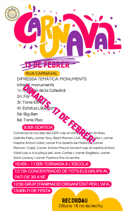 La rua es realitzarà el dimarts dia 17, mantenint el mateix horari que estava establert per a demà. (Recordau que dilluns no és lectiu).